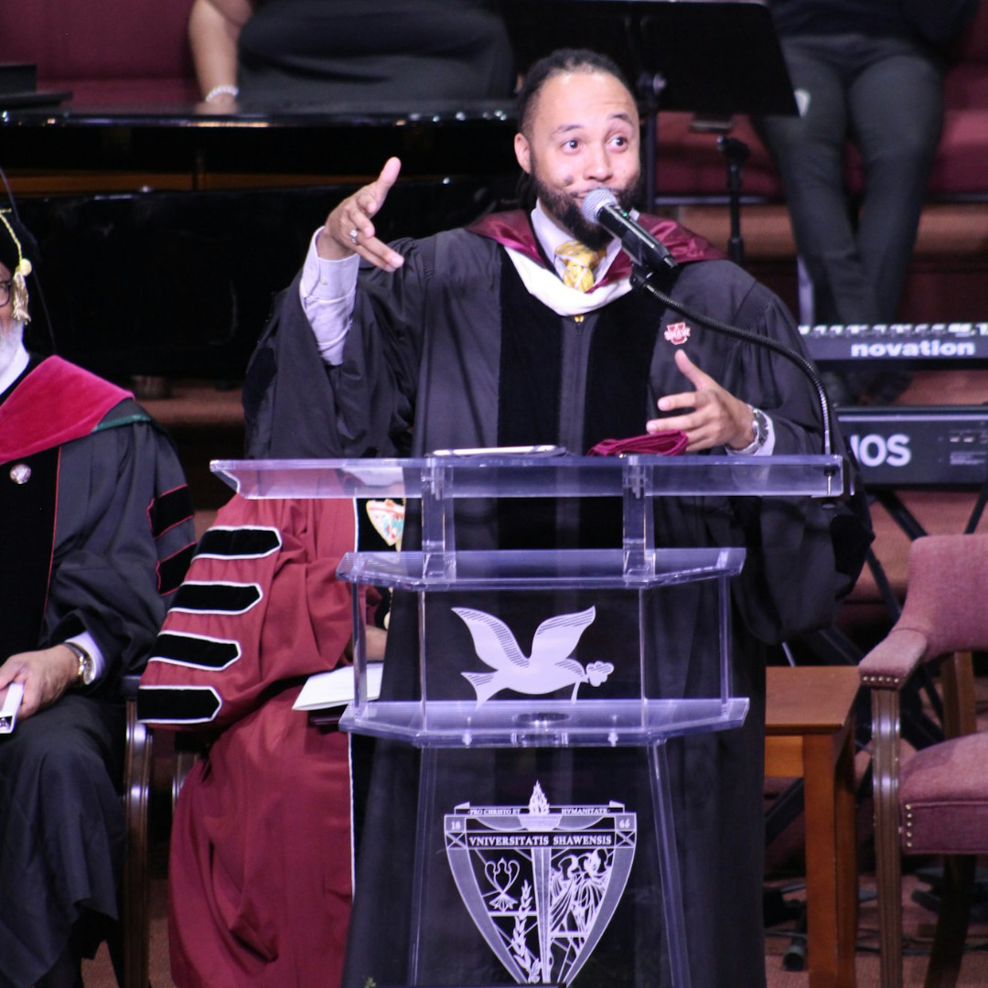 The Rev. Quientrell L. Burrell Jr., D.Min., delivers the keynote address during Shaw University’s baccalaureate service in Thomas J. Boyd Chapel May 10, 2024.