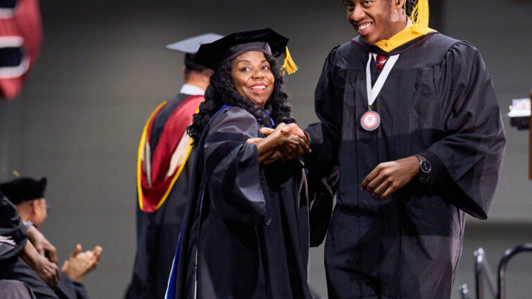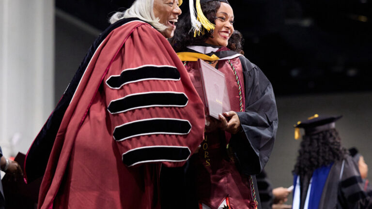 Robert Sheppard III celebrates graduation with Shaw University President and CEO Paulette R. Dillard during commencement exercises at the Raleigh Convention Center May 11, 2024.